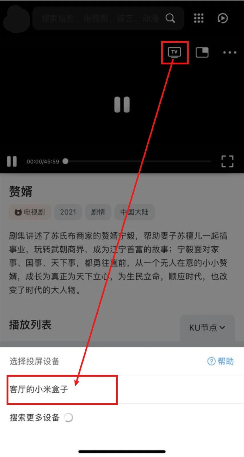 打开QQ浏览器(会接管网页播放器)->打开免费短视频分享大全 - 大中国->播放视频->选中投屏图标->等待搜寻出智能电视/电视盒子->选中,即可投屏。